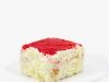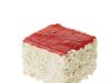 Erdbeer-Vanille: Vanille-Biskuitteig, Vanillecreme, Erdbeermousse, weiße Schokoladensplitter.