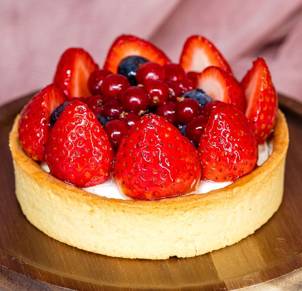 Unsere Obsttorten sind ein wahres Frischeerlebnis, denn wir bereiten sie nach Eingang Ihrer Bestellung frisch zu. Sie sind eine köstliche Verbindung von saisonalen Früchten wie schwarzen und roten Johannisbeeren, Erdbeeren und Wildkirschen auf einem klassischen Biskuitteig mit Butter. Die Creme Patisserie, hergestellt aus Eiern, Butter und einer Prise Maismehl, verleiht der Tarte eine leichte und genussvolle Note.